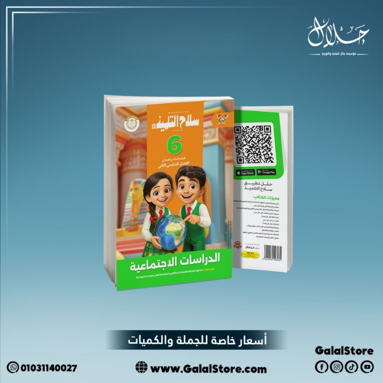 يركز سلاح التلميذ دراسات الصف السادس الابتدائي الترم الثاني على وحدات مثل “النشاط الزراعي والصناعي في العالم العربي”، “الدول العربية وحدودها”، “المناخ والتضاريس”، و”التنمية الاقتصادية والاجتماعية”. يغطي دروسًا عن الزراعة في مصر والعراق والمغرب، الصناعات الحديثة، قراءة الخرائط الطبوغرافية، مع تدريبات على الإحصاءات والمخططات الدائرية والخطية، واختبارات نموذجية تطابق مواصفات الامتحانات الرسمية تمامًا. التصميم يجعل المعلومات المعقدة سهلة الاستيعاب من خلال الرسوم البيانية والجداول.